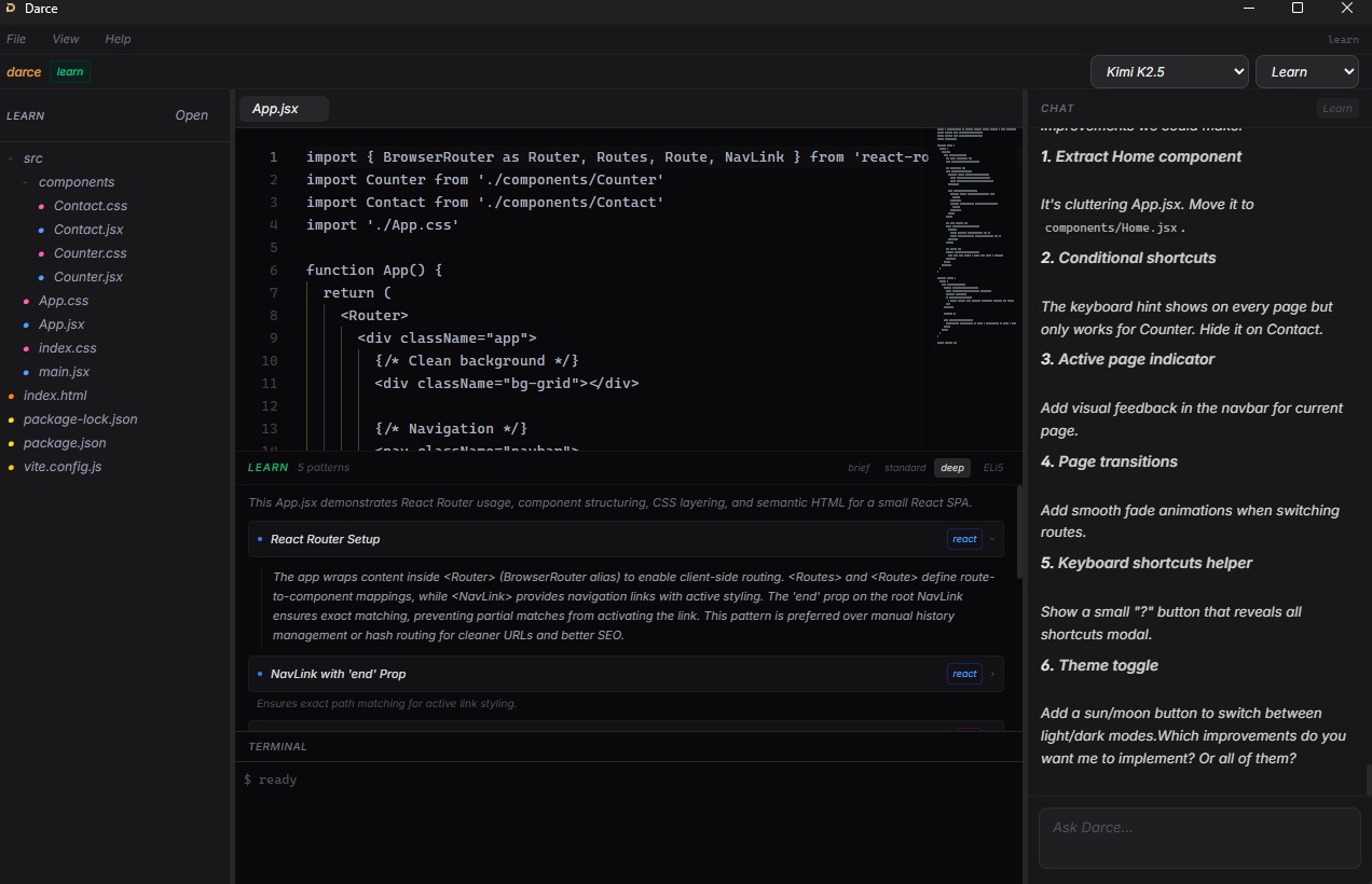 Those tools optimize for speed. Darce optimizes for understanding. Other AI code editors generate code fast but leave you in the dark. Darce explains what it wrote, why it made each decision, and quizzes you on the concepts. You ship fast and actually learn.